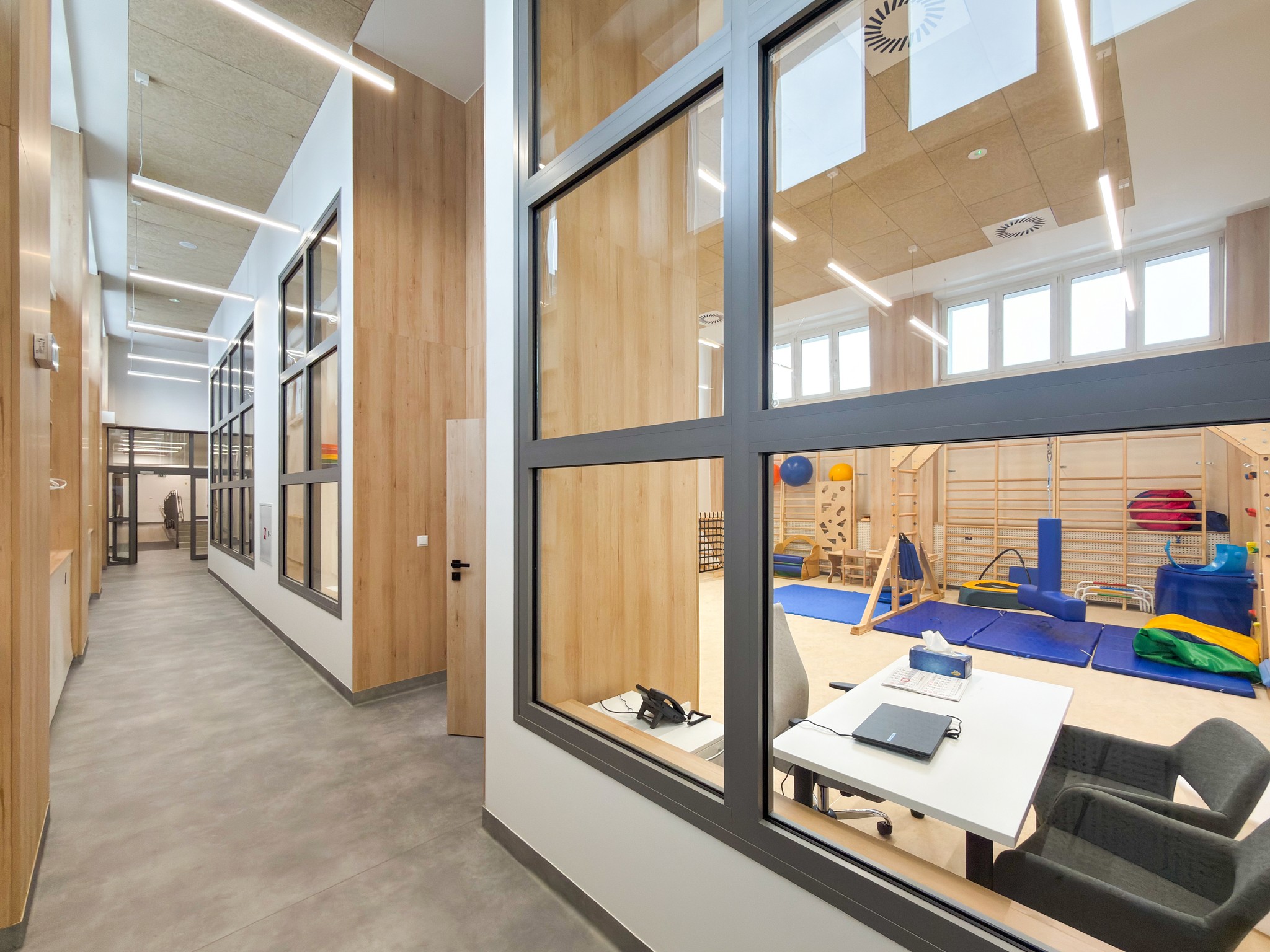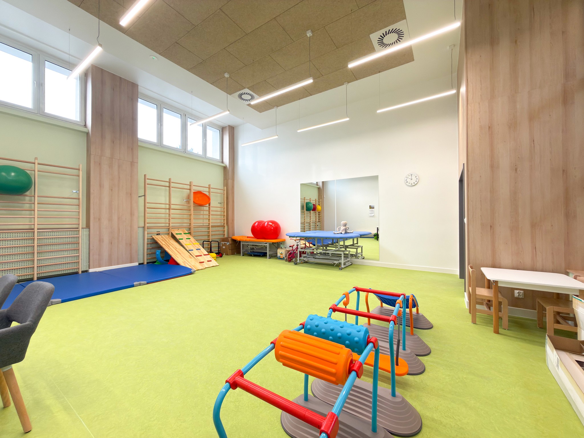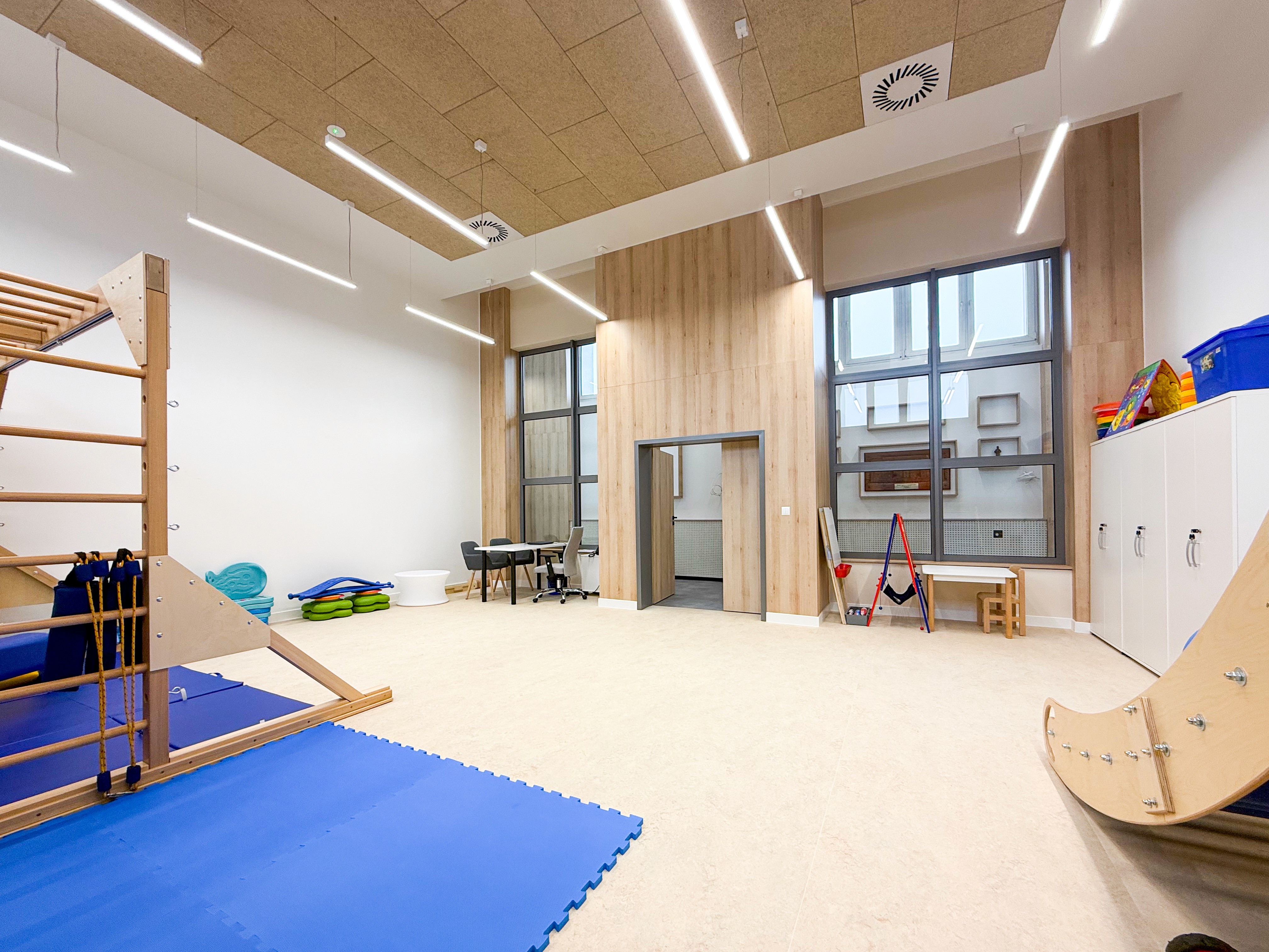 Część rehabilitacyjna znajduje się w budynku dawnej sali gimnastycznej (zlokalizowano tutaj trzy sale rehabilitacyjne) i jej zaplecza. Planowana Fizjoterapia prowadzona będzie metodami: NDT–Bobath integracji sensorycznej, ćwiczeń korekcyjnych oraz ćwiczeń wspomagających motorykę dużą i małą. Pomieszczenia za salą gimnastyczną w których obecnie znajdują się siłownia, sala fitness oraz część techniczna zostaną zaadaptowane na węzeł sanitarny dla pracowników rehabilitacji, pomieszczenie socjalne i pomieszczenie woźnego. Przeznaczenie istniejącej piwnicy pozostaje bez zmian – znajdą się tam pomieszczenia techniczne. Rozwiązanie to zakłada stworzenie nowej wewnętrznej klatki schodowej spełniającej obecne wymagania i normy techniczne w tej części budynku.
