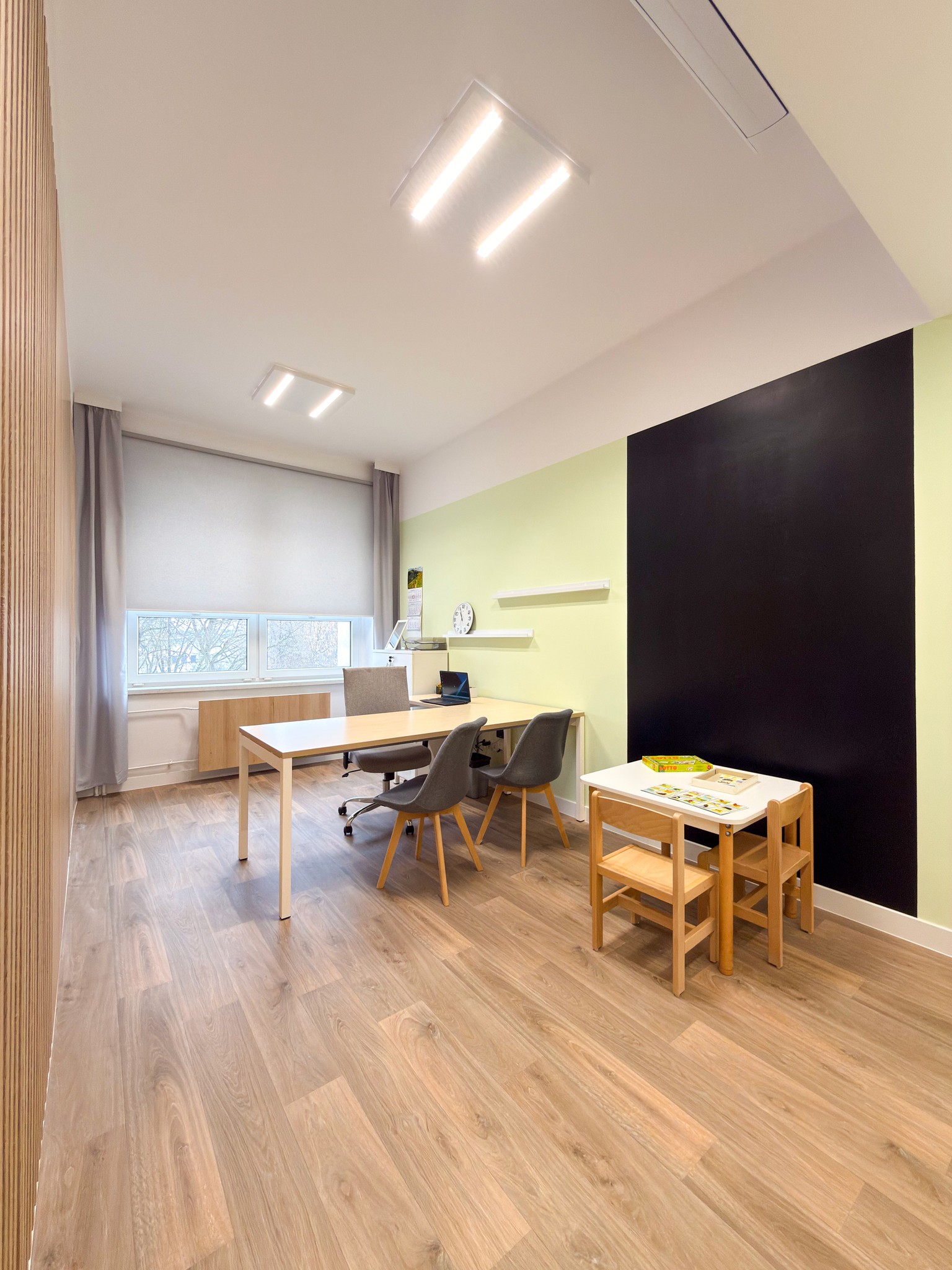 Projekt przebudowy dawnej szkoły górniczej na poradnię psychologiczno-pedagogiczną obejmował kompleksową przemianę wnętrza. W ramach zakresu zaprojektowaliśmy nowy układ funkcjonalny wraz z projektem wnętrz, podyktowany wymaganiom nieróżnorodności pacjentów. Projekt nowej elewacji zewnętrznej był poza naszym zakresem.