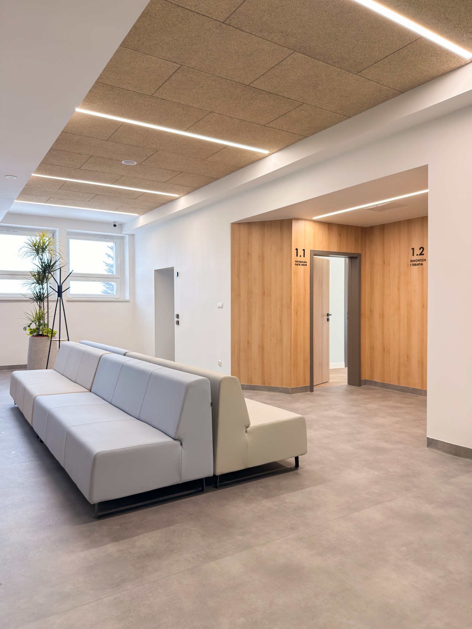W celu stworzenia przestrzeni przyjaznej użytkownikom i łatwiejszej identyfikacji pomieszczeń zaproponowano wspólną strefę wejściową dla każdych trzech gabinetów.