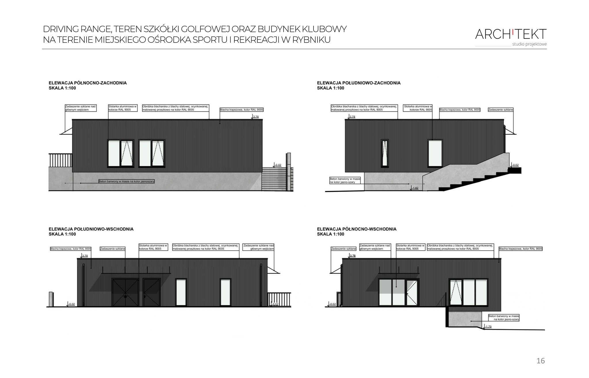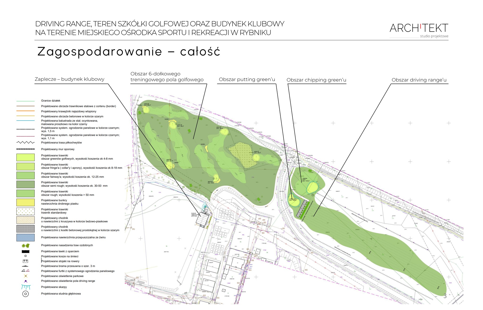 Projekt budowlany i wykonawczy driving range’u (strzelnicy golfowej) oraz budynku zaplecza na terenie Miejskiego Ośrodka Sportu i Rekreacji w Rybniku wraz z infrastrukturą towarzyszącą i elementami małej architektury. Projekt koncepcyjny 6-dołkowego pola treningowego